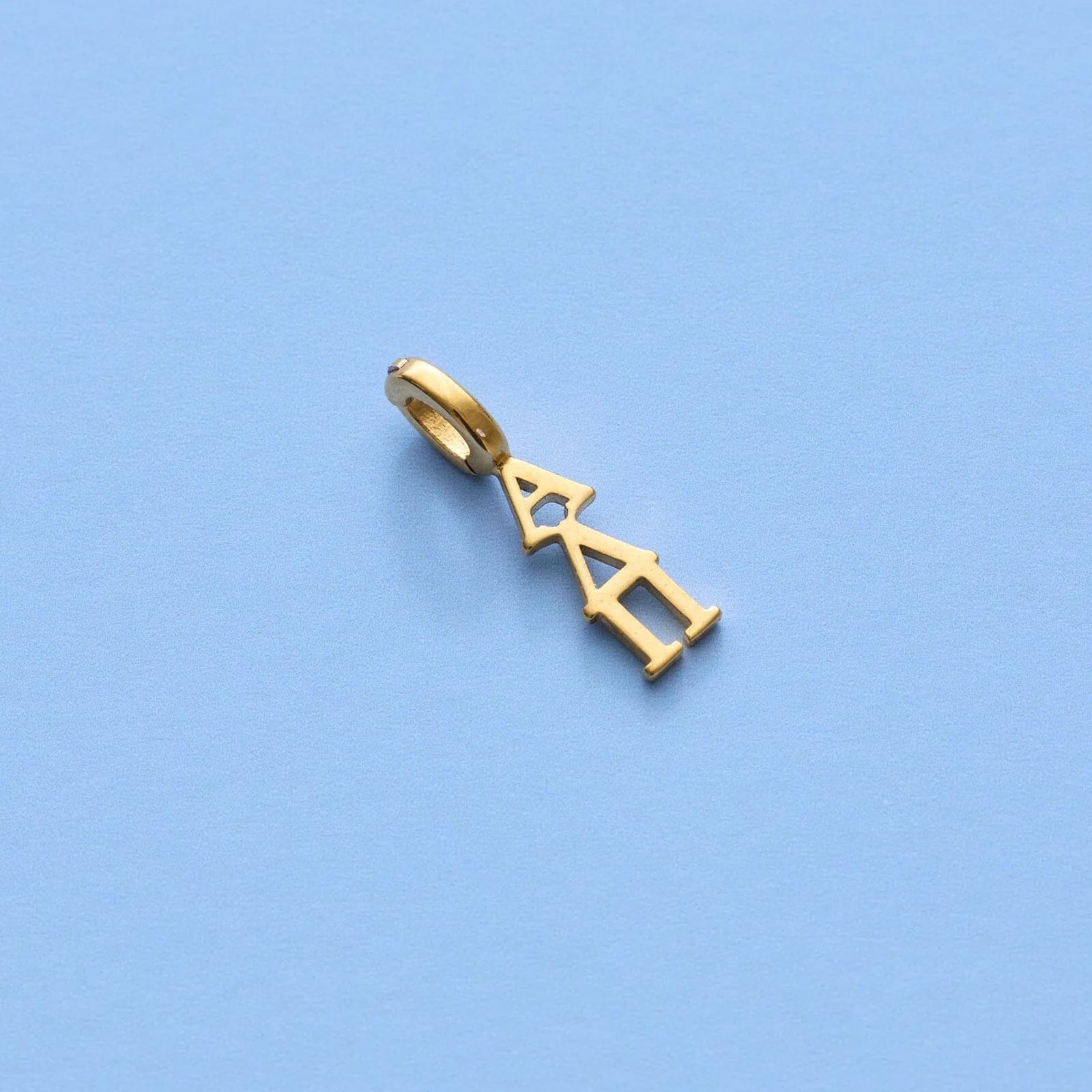 - Greek letter charm made with a stainless steel base and IP gold plating