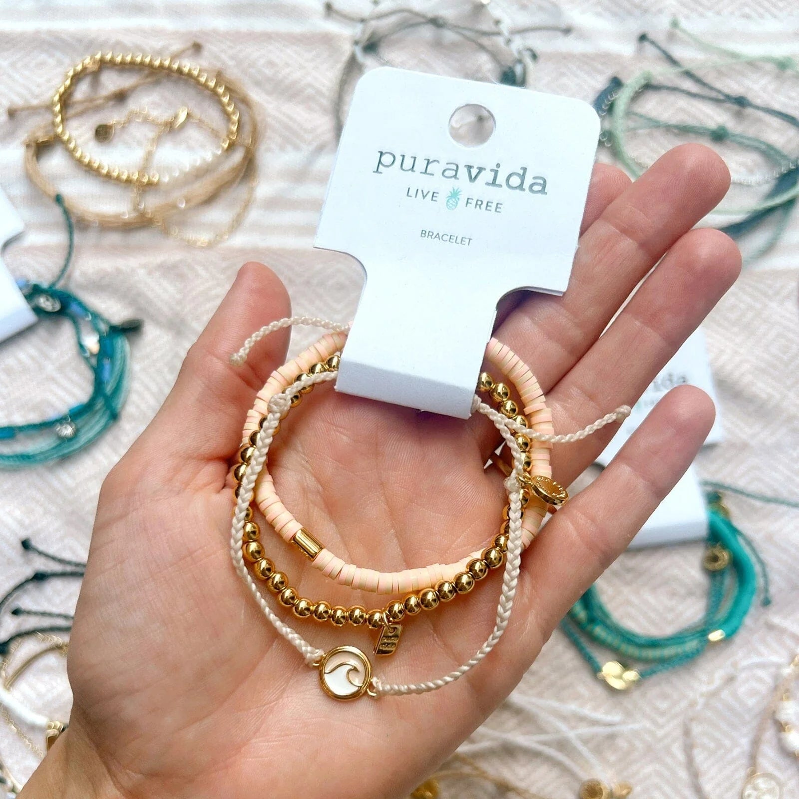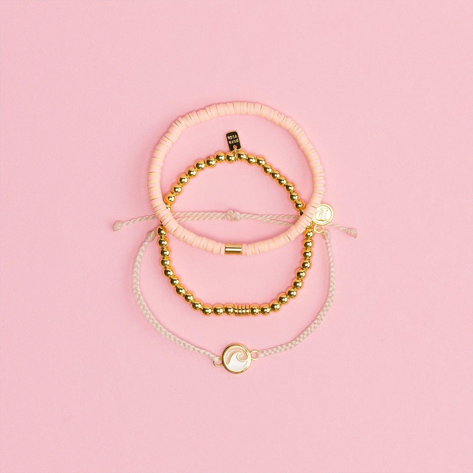 Unveil the Blushing Sunrise Pack, a beautiful trio of bracelets in shades of pink, white, and gold. Whether layered or worn alone, these versatile pieces effortlessly elevate any outfit. Enhance your style and infuse your everyday look with a touch of paradise!