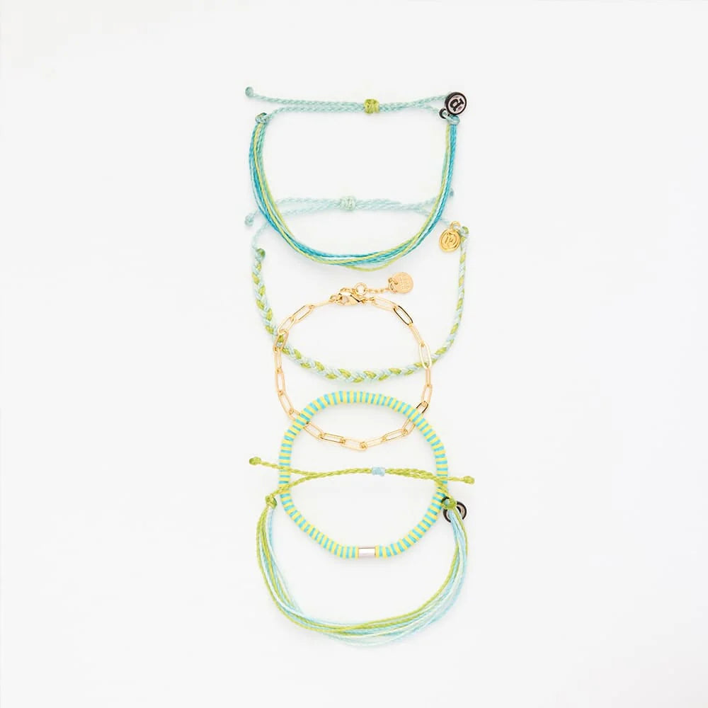Fresh, fun, and full of good energy. The Breakwater Pack mixes bold blues, bright greens, and pops of sunny yellow for that just-back-from-the-beach feel. Whether you're hitting the waves or just want to look like you did — this stack has you covered. Easy to wear, easy to love — your new everyday go-to.