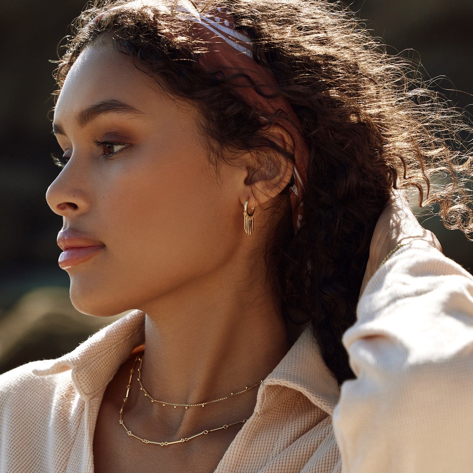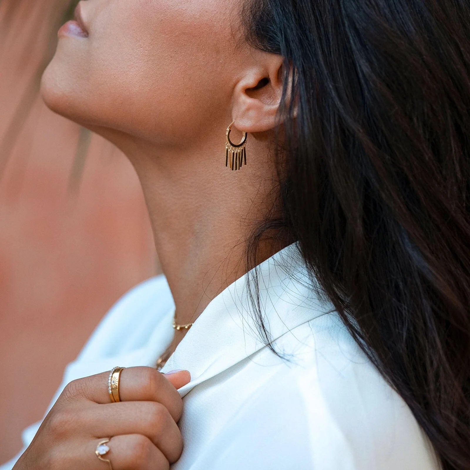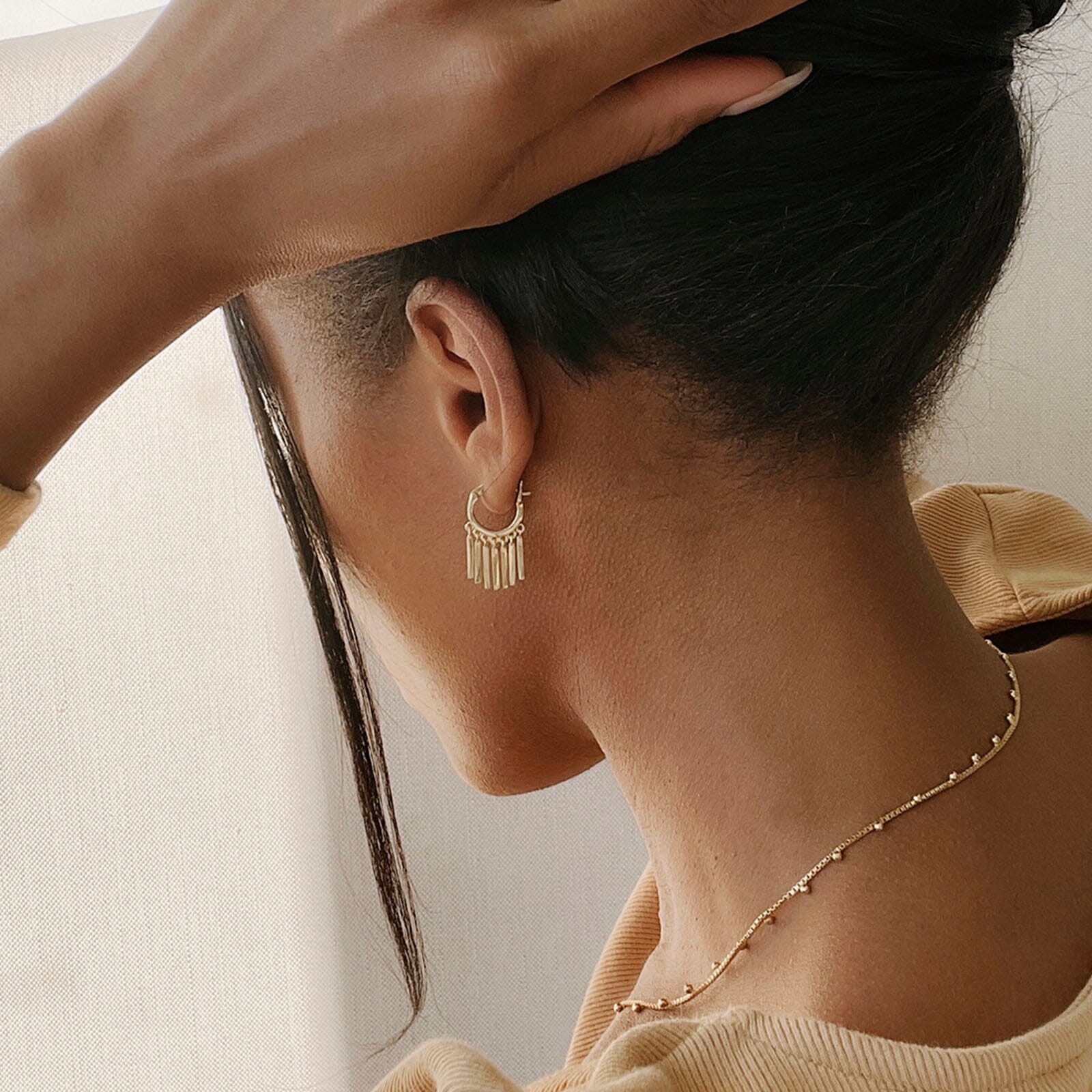 Bohemian meets sophisticated with these Fringe Huggies, featuring a mini hoop with metal fringe pieces layered across the piece – perfect for adding some flare to your look!