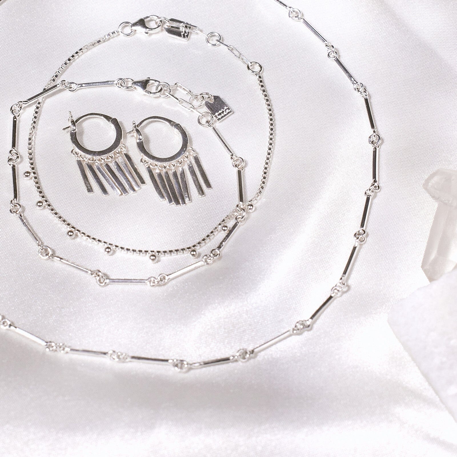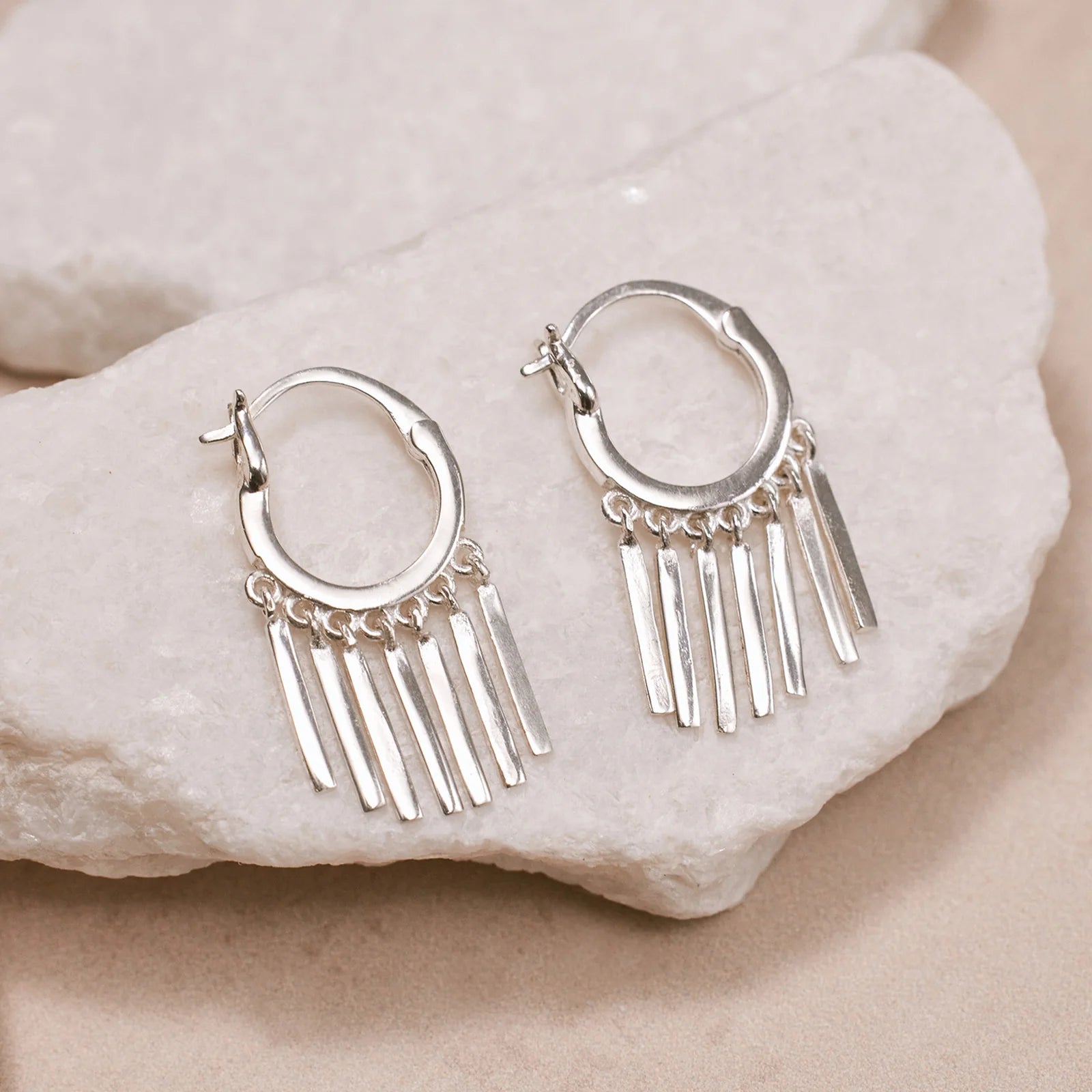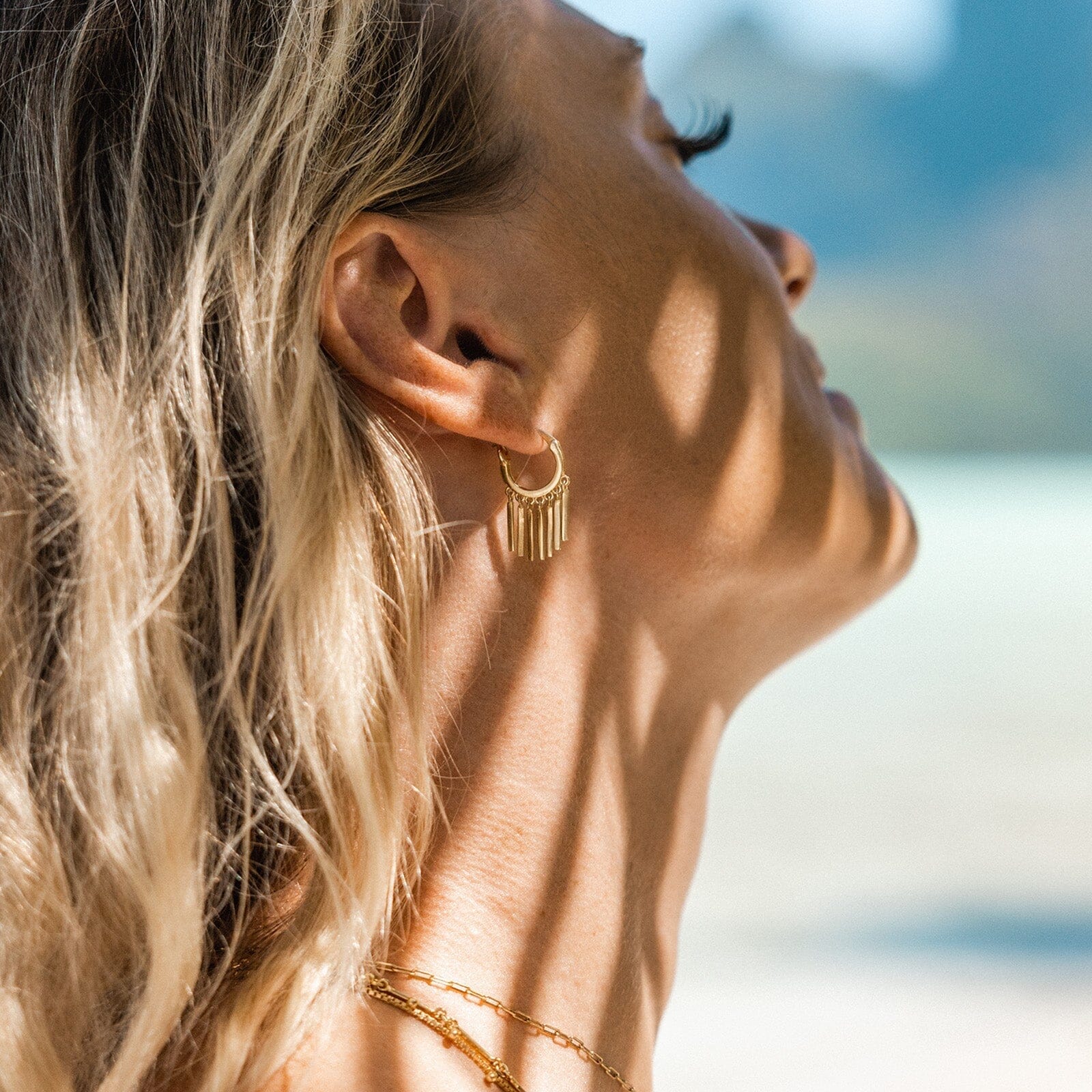 Bohemian meets sophisticated with these Fringe Huggies, featuring a mini hoop with metal fringe pieces layered across the piece – perfect for adding some flare to your look!