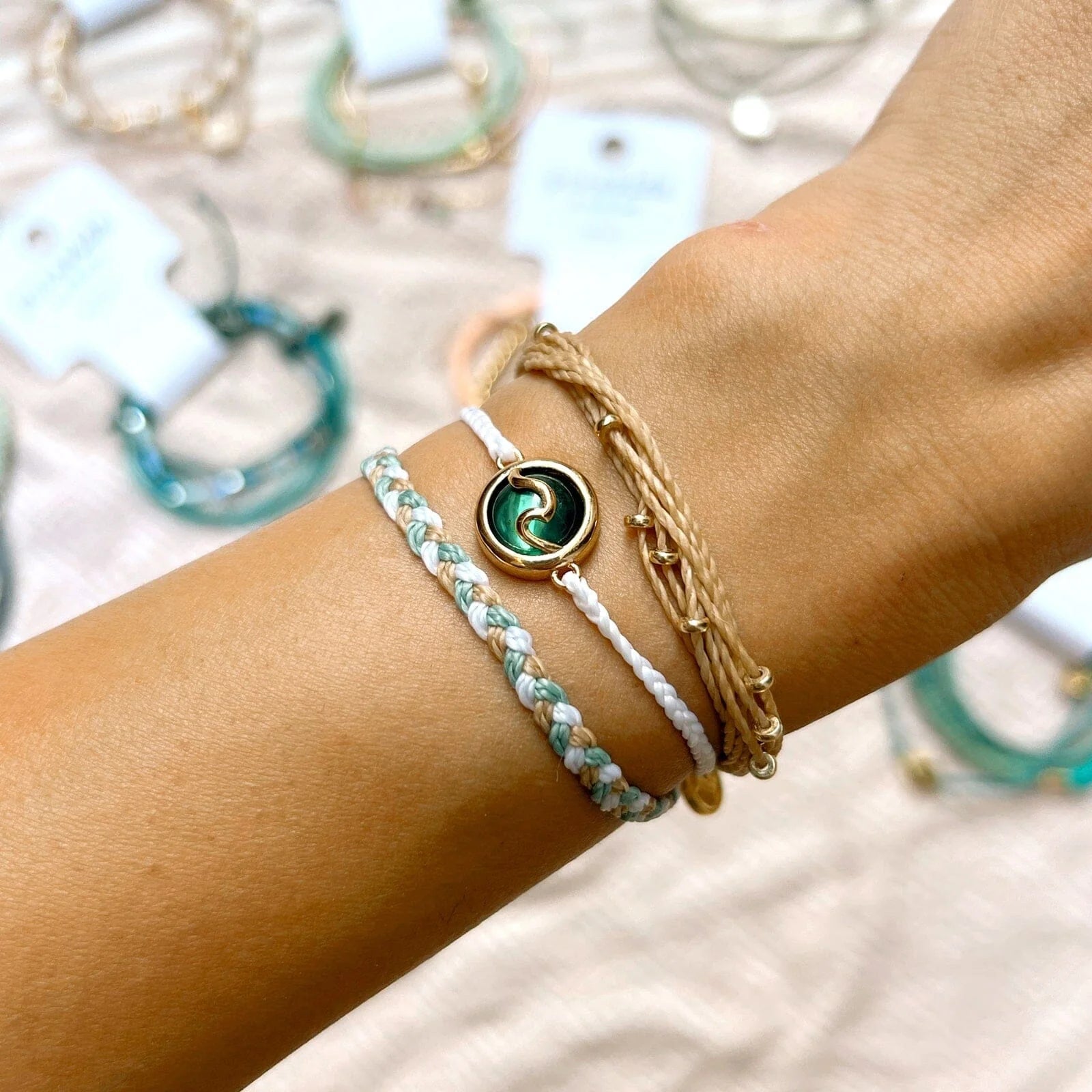 Catch a little coastal calm with the Glowing Wave Pack. Soft tans, ocean blues, and a glossy wave charm come together in a trio that’s simple, serene, and easy to wear every day. Style all three for a laid back, beach inspired stack or pair each one with the pieces you already love.
