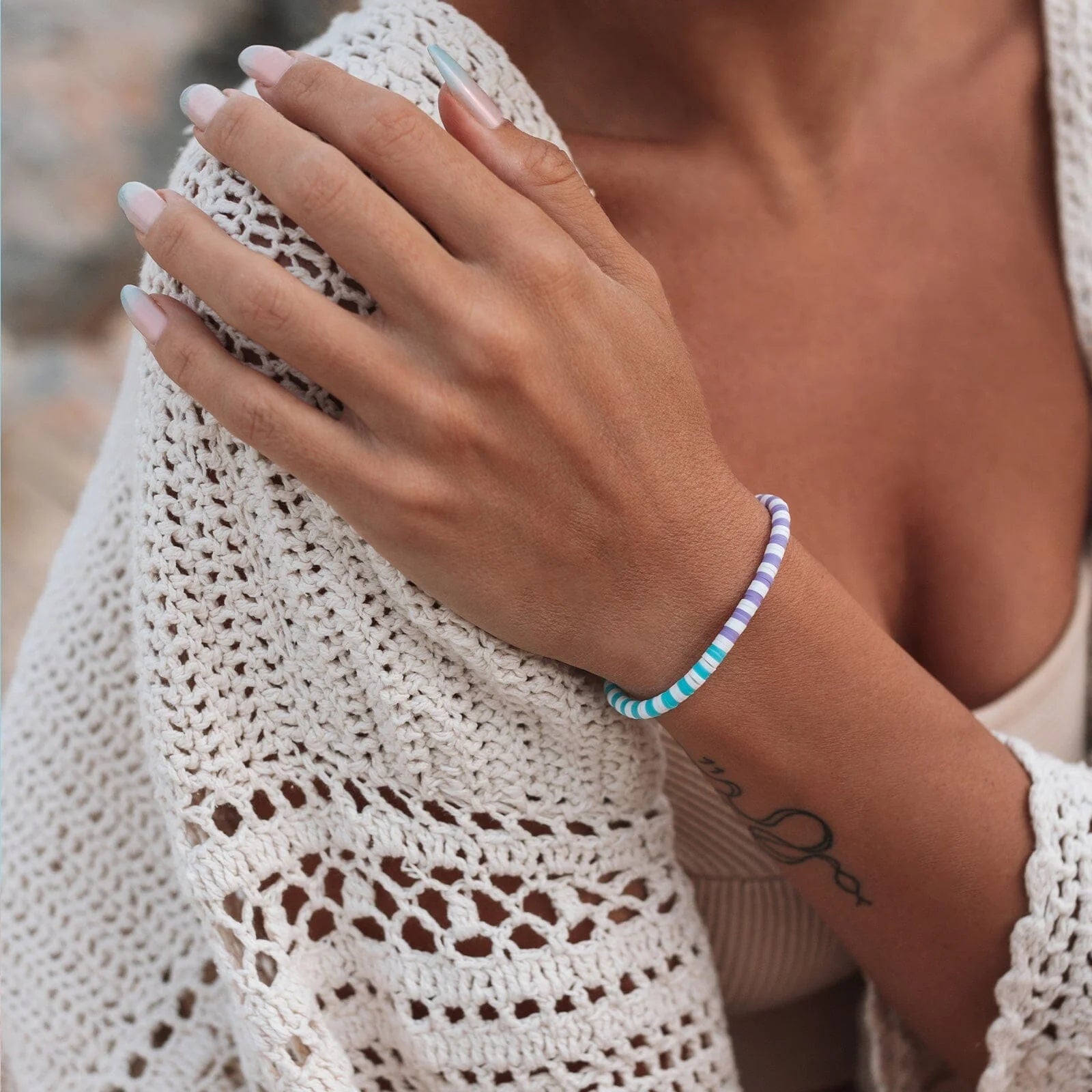 Our Gumdrop Seascape Stretch Bracelet is a delightful fusion of purple, blue and white stripes! This playful accessory adds a burst of color and charm to any ensemble. Crafted for comfort and style, it's the perfect complement to your everyday look. Slip it on and let the Gumdrop Bracelet be your sweet statement piece wherever you go!