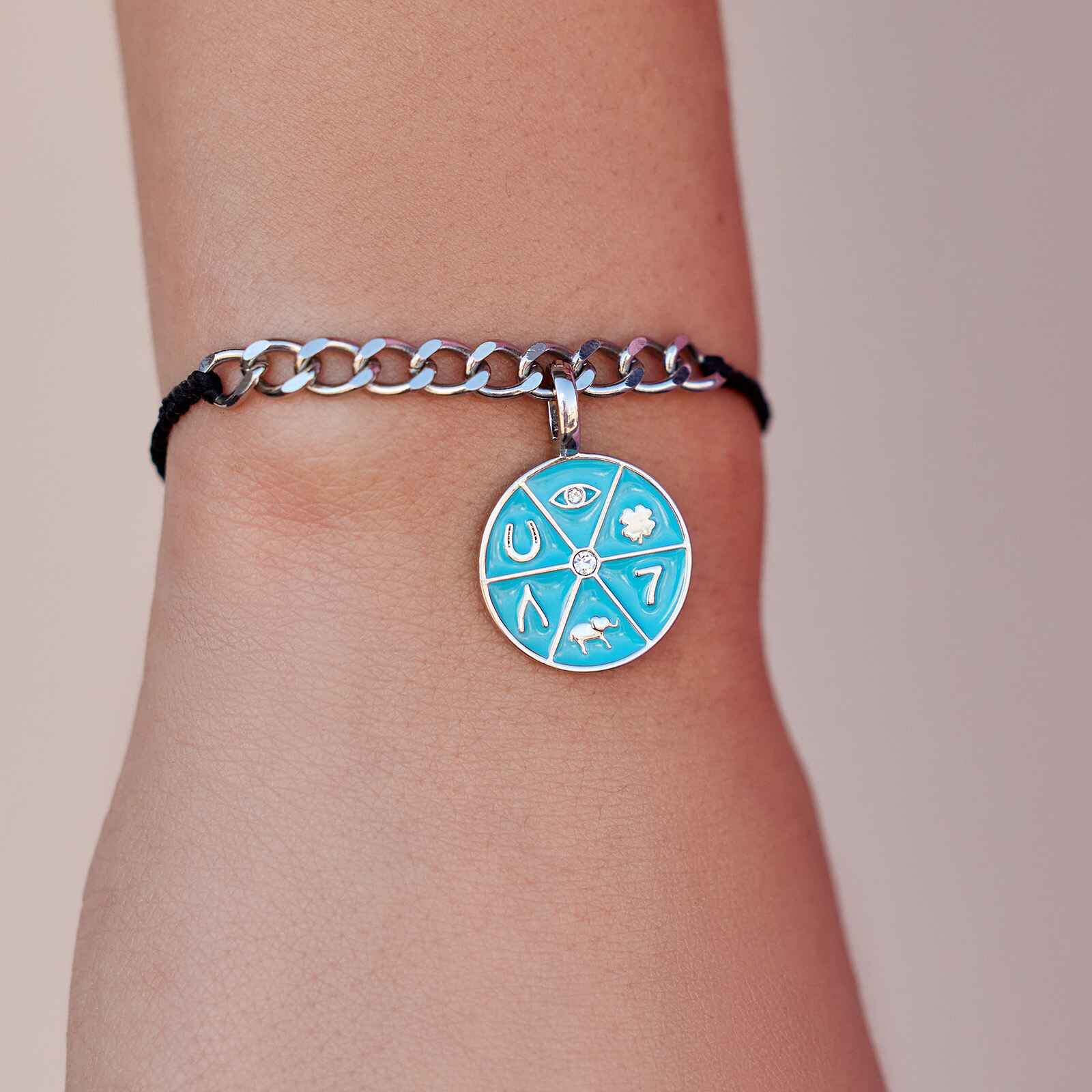 Carry the strength of symbolism with you everywhere you go. The Harper Icons of Luck Charm holds five unique, powerful motifs that meet at a faceted, glass middle stone on a glossy, enamel-plated casting.