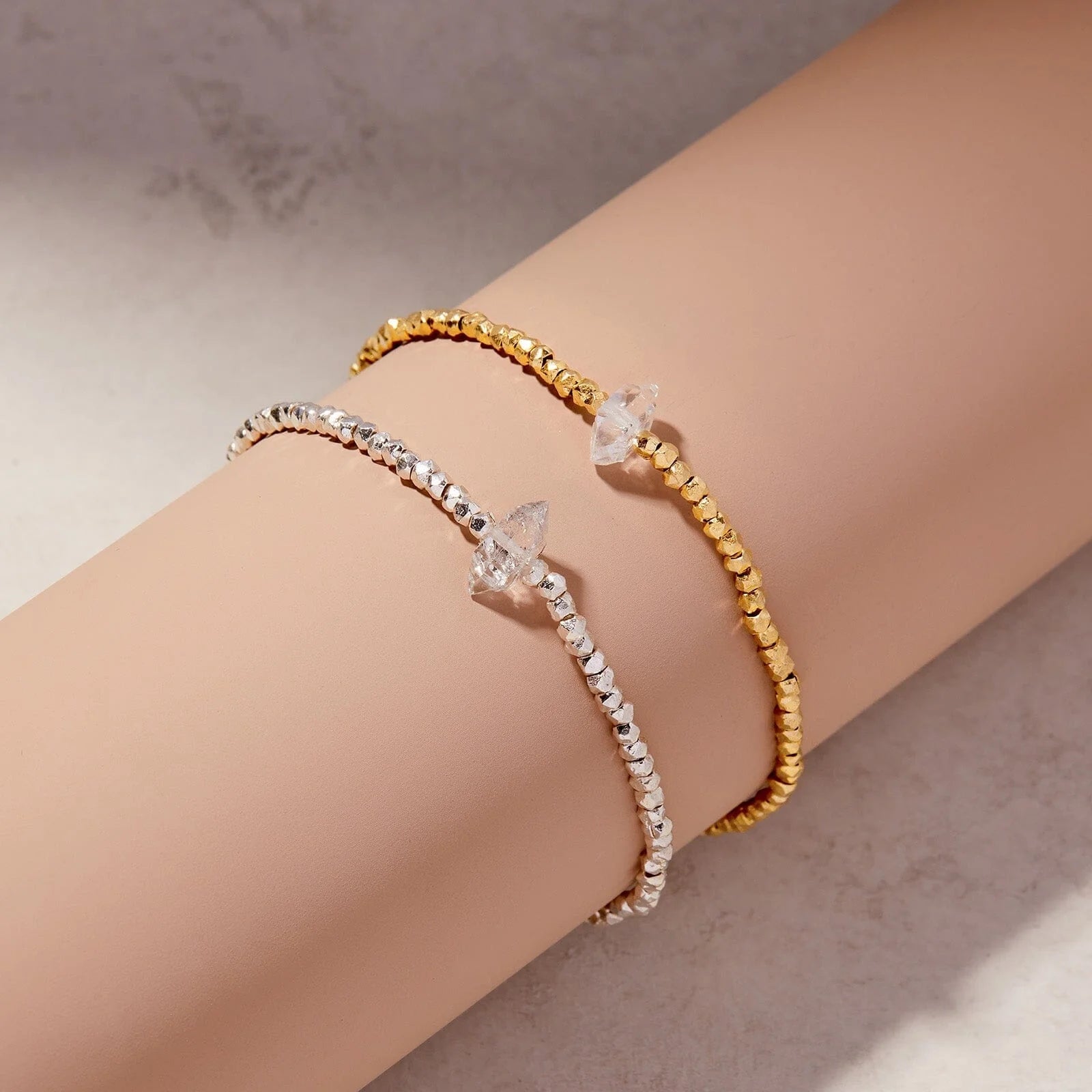 Like the first glimmer of dusk on a crisp fall evening, the Herkimer Stretch Bead Bracelet is something you’ll never forget about. This piece is made up of sterling silver or 18K gold plating ball beads, and features a natural Herkimer Diamond bead in the center for a look to remember.