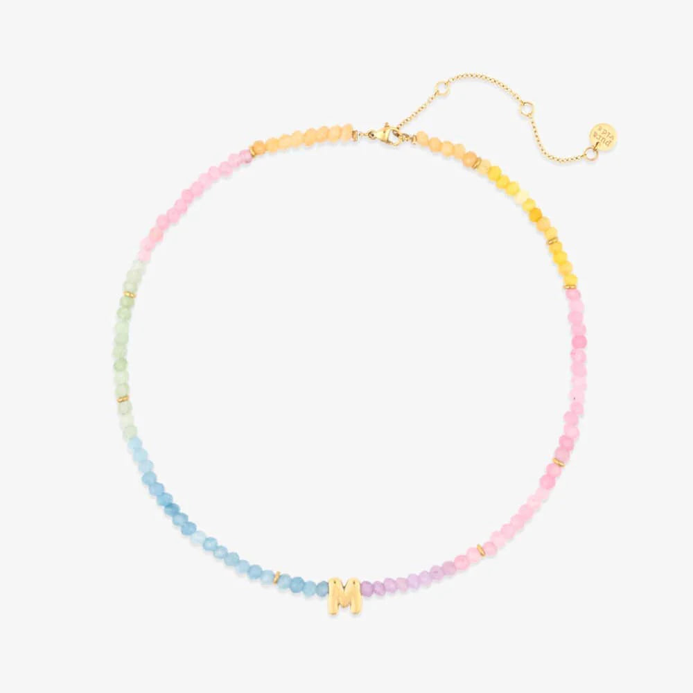 Show off your letter, your way. This pastel-perfect choker features ombré stone beads and a bold gold initial that’s all about standing out. Waterproof and ready for anything—just like you.Waterproof