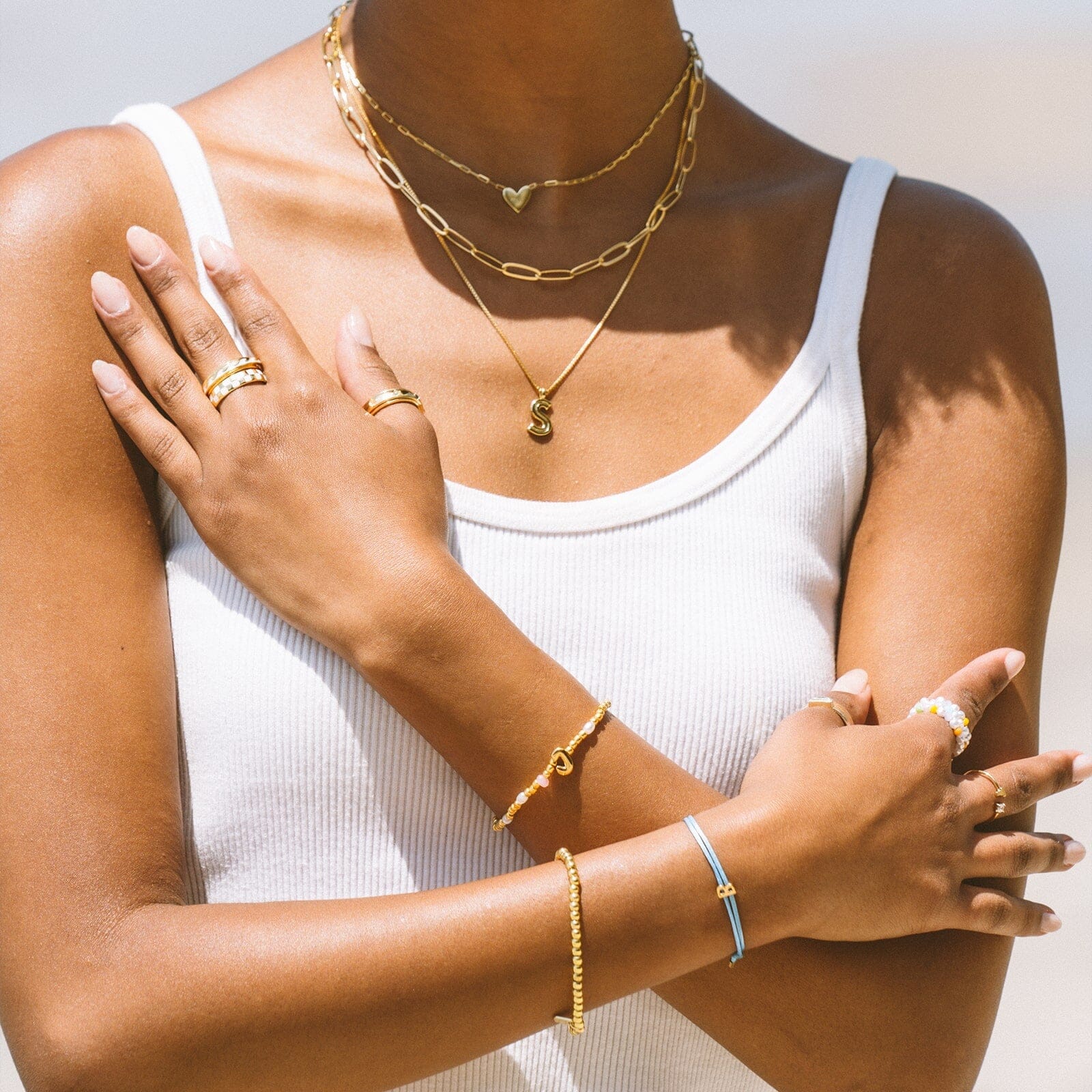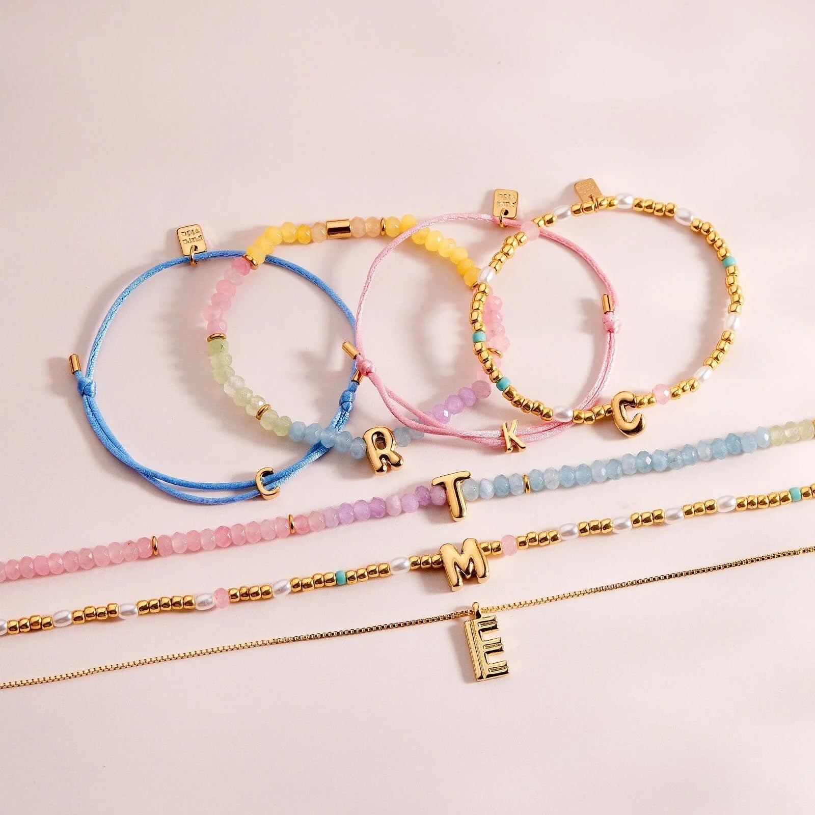 Your letter, your look. This stretchy, waterproof bracelet is strung with playful pearl beads, colorful seed beads, and a bold gold initial that’s all about you. Slip it on, stack it up, and let your style speak louder than words.