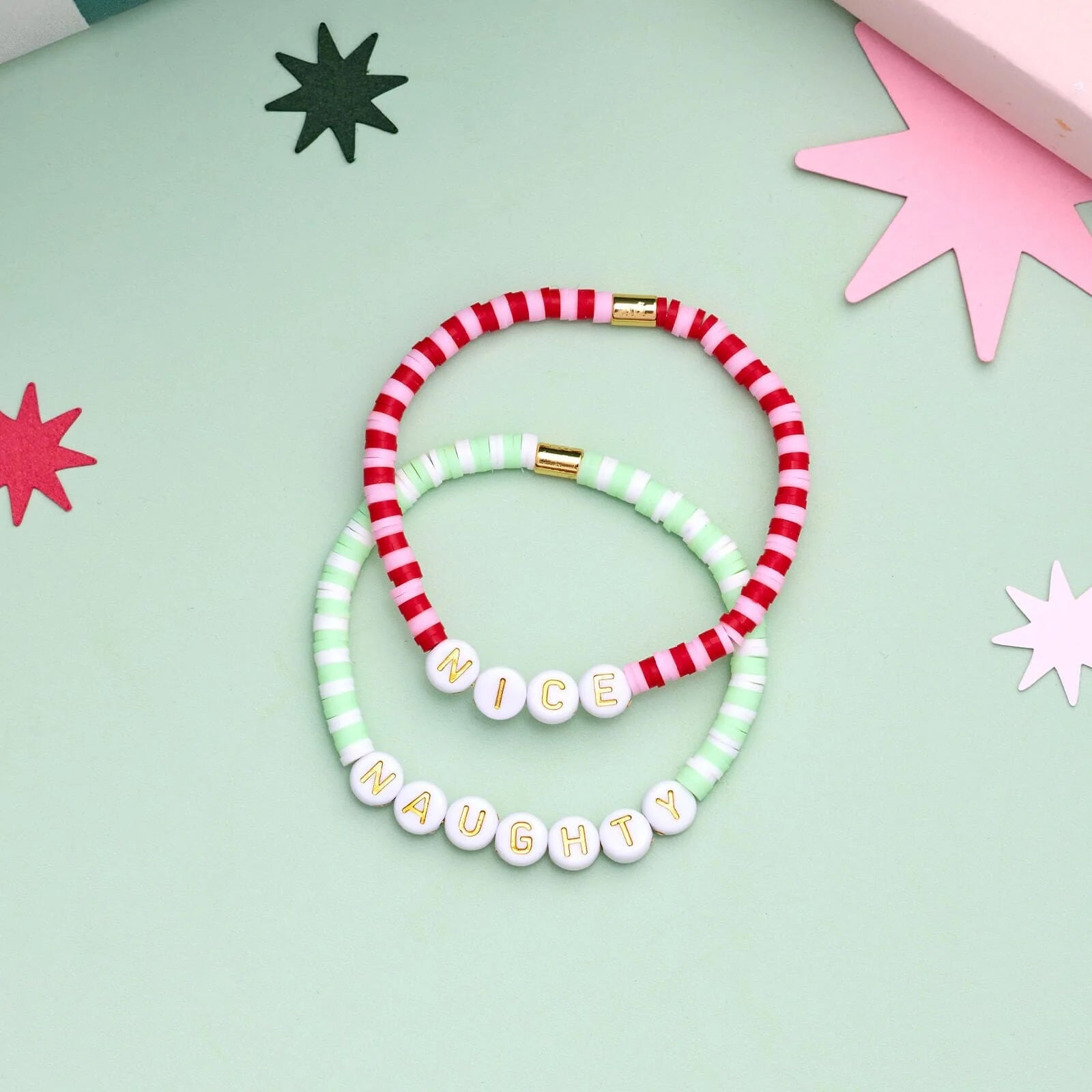 Get into the holiday spirit with our Naughty or Nice Stretch Bracelet Set! Featuring vibrant red, pink, and green beads, this playful duo includes one bracelet that says "Naughty" and the other "Nice"—perfect for helping Santa keep track of who's been good or bad this year. Spread festive cheer and show off your holiday style while giving Santa a little assist!
