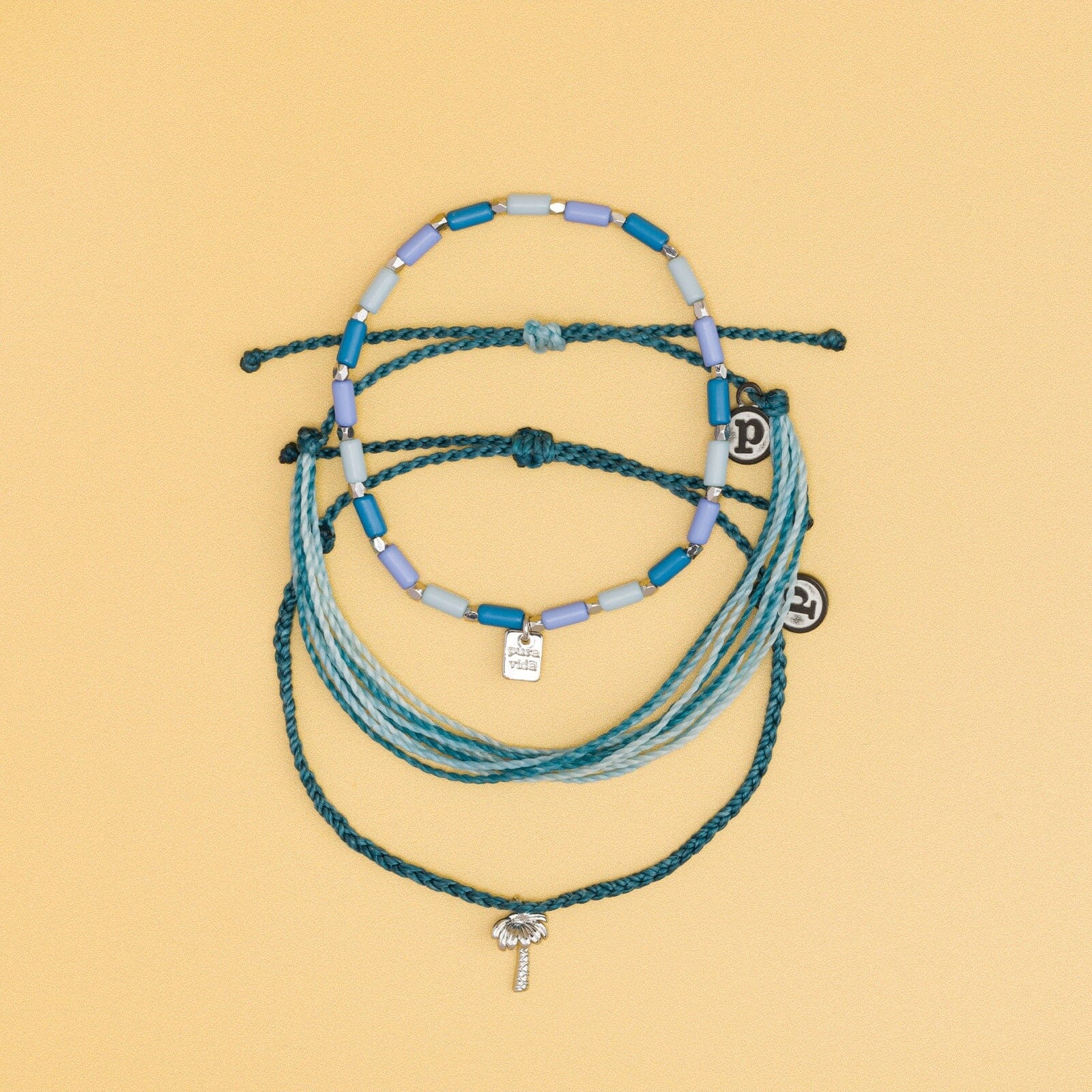 Embrace island vibes with the Paradise Palms Pack! This delightful trio features a tranquil blue and silver hues that captures the essence of calm beaches, an original blue bracelet for that effortless style, and a playful mini braided sting bracelet adorned with a silver palm tree charm, and a blue and turquoise stretch bracelet. Perfect for layering or wearing solo, this pack brings a slice of paradise to your everyday look!Â
