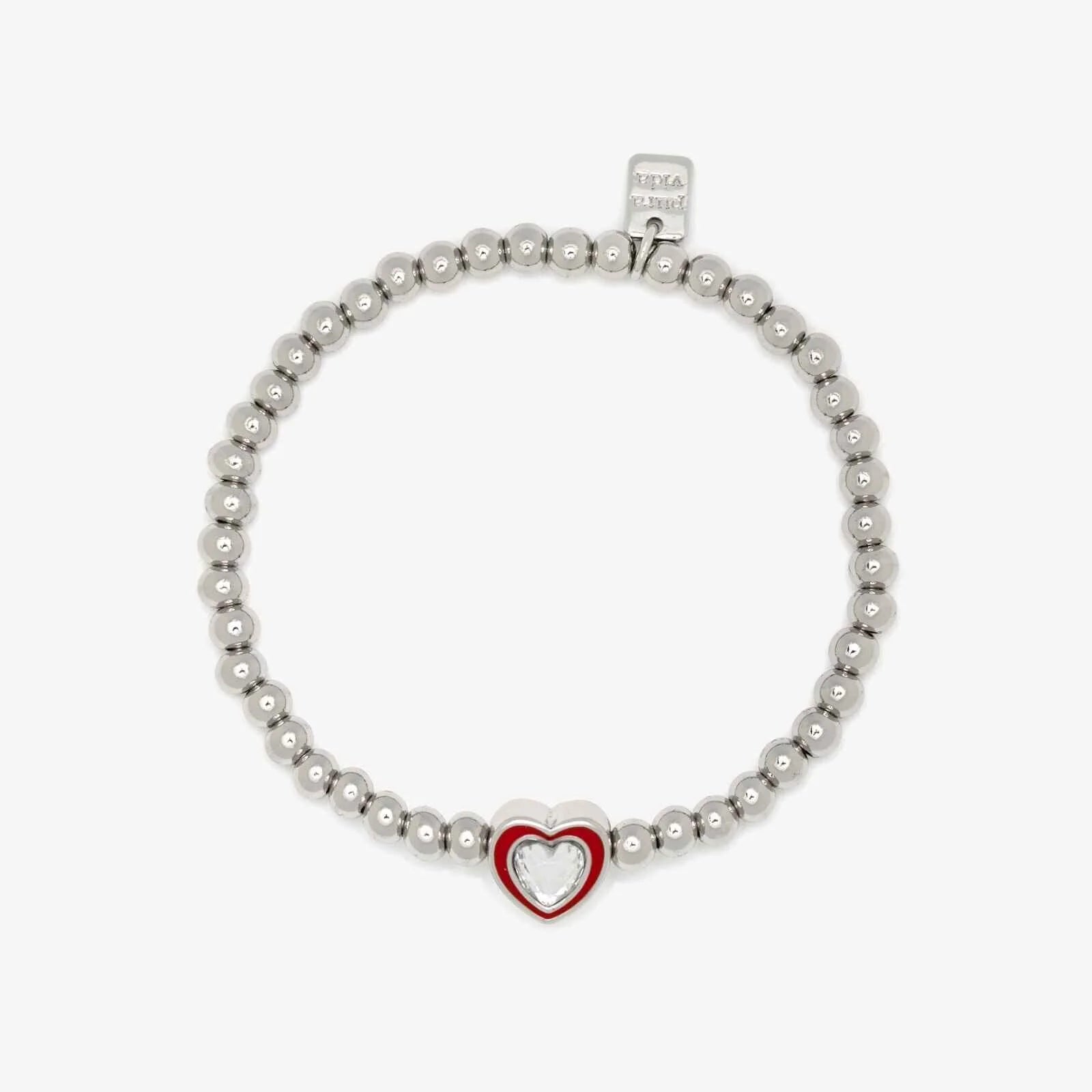A standout shape set in a uniform beaded band, the Stone & Enamel Heart Stretch Bracelet adds an unexpected twist to your Valentine's Day stack. The center pendant features a rhodium-plated base centered around a heart-shaped clear glass stone.